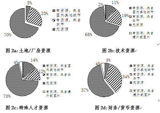 从民营企业在土地/厂房资源、技术资源、特殊人才资源和财务/货币资源4个方面的获取情况来看,近六、七成的企业,近5年来,未获取上述相关资源(见图2)。即使企业有获取相关的资源,除特殊人才资源有较大比例来自国内其它省份外,其它三种资源绝大多数来自本市,可见企业跨区域发展能力较弱。