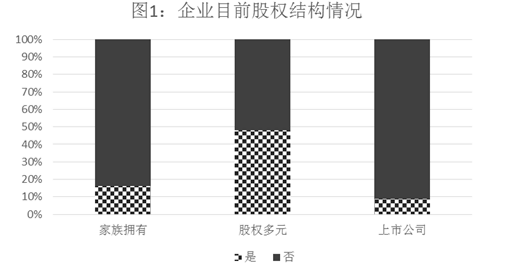 5、资本结构:民营企业股权结构多样。56家样本企业中,按股权多元情况来分,48.2%的企业属于股权多元;按家族拥有情况来分,仅16.1%的企业属于家族拥有;按上市公司情况来分,仅8.9%的企业目前已经上市(见图1)。