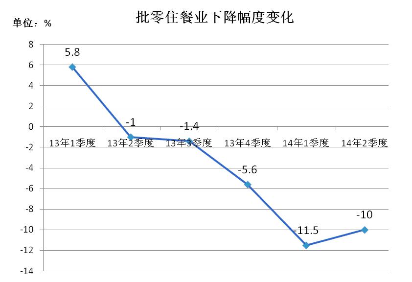 如图所示,批发零售住宿餐饮业能源消耗由2013年上半年转增为降,且降幅不断扩大,今年一季度降幅最大,达11.5%。主要原因一是受政策影响,营业额下降;二是企业为了节约成本,调整了经营方案,并对供能管道进行了改建,节约了能源。