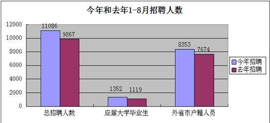 在招聘方面,276家企业今年1-8月共完成招聘11086人,比去年同期多1219人;其中应届大学毕业生1352人,比去年同期多233人;外省市户籍人员8353人,比去年同期多679人。其中,未招聘人员的企业有105家,招聘10人以下的企业65家,招聘10人以上100以下的企业83家,招聘100人以上的企业23家,其中工业占19家,服务业占4家。