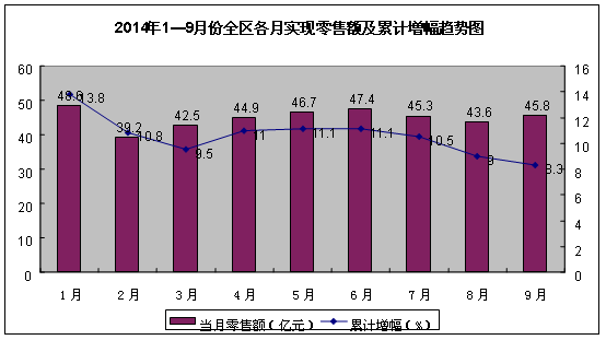 从1—9月份趋势看,尽管有诸多节庆假日,但在全社会奉行勤俭节约之风积极倡导下,全区的高档消费、集团消费减少,高端零售和高档餐饮业相比往年依然出现一定幅度回落。全区实现社会消费品零售额为404亿元,同比增长8.3%。其中 1月份由于春节因素,实现的当月零售额48.6亿元和累计增幅13.8%均为1—9月最高,至9月份回落至45.8亿元,累计增幅为8.3%。