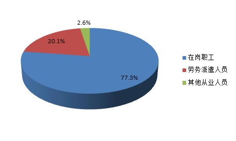 从业人员包括在岗职工、劳务派遣人员和其他从业人员三类,其中在岗职工32.8万人,占全部从业人员的77.3%:劳务派遣人员8.5万人,占全部从业人员的20.1%。
