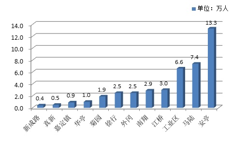 我区各街镇从业人员就业人数相差较大,其中安亭镇从业人员最多,达到13.3万人,占比为31.0%。马陆镇和工业区的从业人员相对较多,分别为7.4万人和6.6万人,占比17.2%和15.4%。三个街道即新成路街道、真新街道和嘉定镇街道的从业人员均不足1万人。