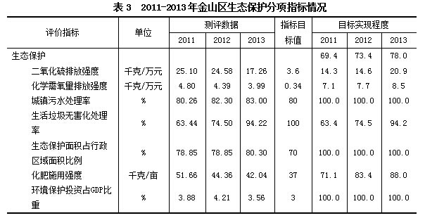 2013年,金山区生态保护目标实现程度为78%,比2011年提高8.6个百分点(见表3)。在评价体系的四个方面中,本区生态保护目标实现程度起点较低、提升较快,既有压力又有希望。测评结果显示,2013年金山区环境污染防治取得积极进展,主要是环保投入持续增长、主要污染物排放控制力加强、污水处理水平和能力稳步提高,生活垃圾收集无害化处理系统进一步完善,化肥施用强度下降,有效地减轻了农业面源污染。