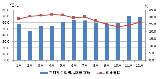1-12月当月全区社会消费品零售总额及累计增幅情况