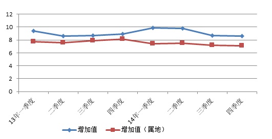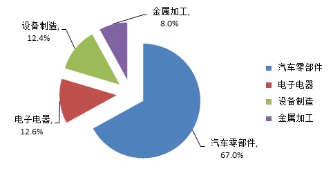 工业经济稳中趋缓。2014年全区规模以上工业总产值突破五千亿大关,达到5082.7亿元,同比增长7.1%。其中,属地产值3119.9亿元,同比增长4.4%,增速继续小幅放缓,环比减少0.1个百分点。四大重点行业合计完成工业总产值2510.7亿元,占全区产值总量的比重高达80.5%。其中,汽车零部件与设备制造分别完成工业产值1682.8亿元与312.4亿元,同比分别增长3.3%与3.1%。