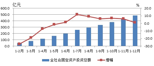 固定资产投资巩固增长。2014年全区完成固定资产投资总额485.1亿元,同比增长1.1%。其中,第二产业完成投资99.5亿元,同比下降14.3%;第三产业完成投资385.4亿元,同比增长6.1%,其中基础设施完成投资46.4亿元,同比增长21.2%。