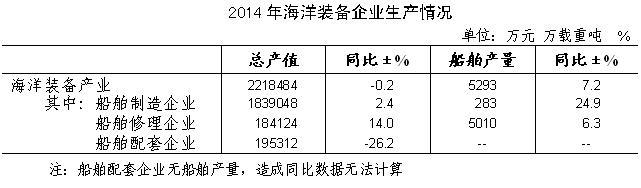 从产值看,2014年全县海洋装备产业累计完成总产值221.8亿元,同比下降0.2%;从产量看,2014年全县海洋装备产业累计完成船舶产量5293万载重吨,同比增长7.2%;海洋装备产业产值和产量同比情况逆向而行。