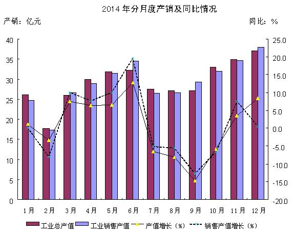 2014年1-12月,全县工业完成总产值352.9亿元,同比增长1.4%;完成销售产值352.7亿元,同比增长2.3%;累计产销率为99.9%。其中12月份完成总产值37.1亿元,环比增长6.3%,同比增长8.3%;完成销售产值38.0亿元,环比增长9.5%,同比增长0.5%;单月产销率为102.5%。