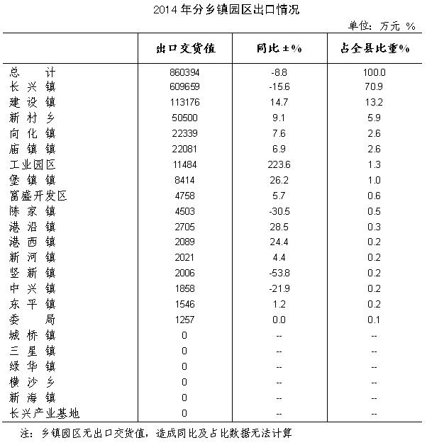 2014年,全县工业企业累计实现出口交货值86.0亿元,同比下降8.8%。相较于产销总值的起伏,工业出口始终降幅明显,外销状况依旧不容乐观。有工业出口的16个乡镇园区中,同比下降的共5个,仅占总数的31.3%;但这三成的乡镇、尤其是长兴镇则在很大程度上决定了全县工业的出口形势。