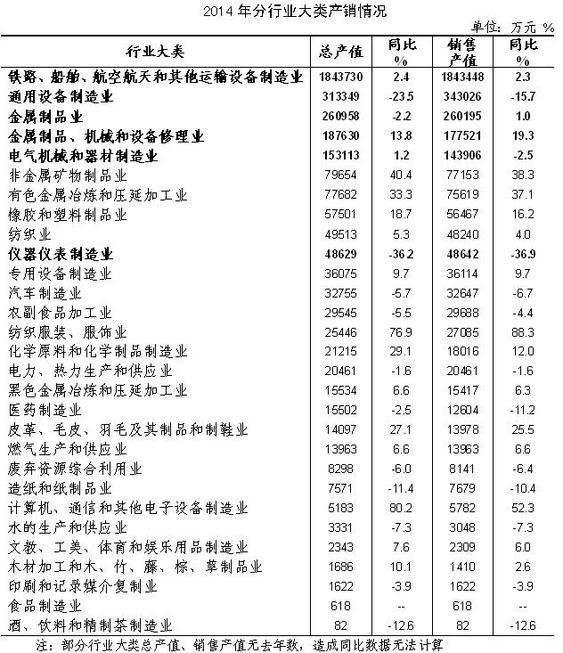 分行业大类来看,2014年总产值、销售产值同比增长的行业均为17个,占行业总数的58.6%。经济总量占比前十的行业中,实现产销同步增长的共6个,可见我县工业产销运行的基本面较为平稳。