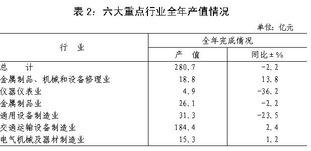 六大重点行业呈现“三增三减”的格局,降幅较上年有所收窄。2014年,全县六大重点行业实现工业总产值280.7亿元,比上年下降2.2%,降幅较上年收窄13.5个百分点。从具体行业看,实现增长的行业有:金属制品、机械和设备修理业,实现产值18.8亿元,比上年增长13.8%;交通运输设备制造业实现产值184.4亿元,比上年增长2.4%;电气机械和器材制造业实现产值15.3亿元,比上年增长1.2%。产值同比下降的行业有:通用设备制造业,实现产值31.3亿元,比上年下降23.5%;金属制品业,实现产值26.1亿元,比上年下降2.2%;仪器仪表制造业,实现产值4.9亿元,比上年下降36.2%。