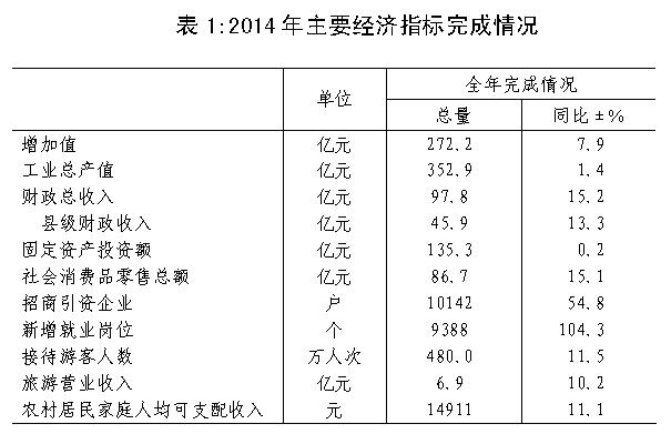 2014年,全县产业结构调整力度加大,第三产业增长拉动作用明显。全年实现增加值272.2亿元,比上年增长7.9%,增幅高出年度计划0.9个百分点,顺利实现全年目标任务。其中,第一产业预计实现增加值23.4亿元,增长2.1%;第二产业继续在全县经济总量中占据主导地位,实现增加值128.3亿元,增长3.1%;第三产业今年来发展迅速,增速领先于全县总量增长及第一产业和第二产业增长,实现增加值120.4亿元,增长14.8%。