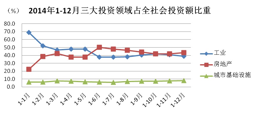 从三大投资领域占全社会投资额比重看,格局与去年不同。从下半年起,房地产投资取代工业投资占比排名第一,城市基础设施投资占比平稳。全年工业投资占比39.1%,同比下降5.5个百分点;房地产投资占比43.6%,同比提高1.2个百分点;城市基础设施占比7.8%,同比提高0.2个百分点(见图2)。