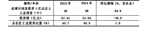 全年在建计划总投资1亿元以上工业项目虽然绝对值有所下降,但投资额占全区工业投资比重增大,同比提高1.8个百分点,拉动作用显现,为稳定工业投资提供保障(见表2)。