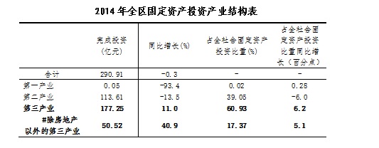 2014年全区全社会固定资产投资完成年初计划,投资总额为290.91亿元,同比下降0.3%。