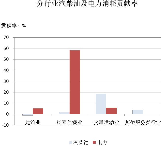 汽油、柴油和电力是非工业能源调查单位的主要能耗品种,油品和电力用能的缩减对全县非工业用能下降的贡献率分别为22.4%和76%,其中油品和电力分行业的贡献率如图所示: