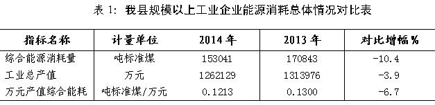 2014年我县规模以上工业企业能源消耗总量15.3万吨标准煤,同比下降10.4%;完成工业总产值126.2亿元,同比下降3.9%;万元产值综合能耗0.1213吨标准煤/万元,同比下降6.7%。(详见表1)