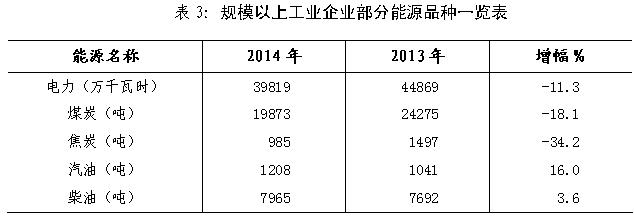 从能源品种内部结构看:电力、煤炭和焦炭为我县规模以上工业企业的主要能源消耗品种,2014年三者的消耗量占全县的比重为87.9%,且2014年均有超过10%以上的降幅。(详见表3)
