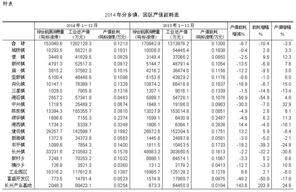 从乡镇、园区降耗情况分析看:2014年全县21个乡镇、园区镇产值能耗降幅为6.7%,其中,万元产值能耗下降的有18个,上升仅为3个乡镇,节能降耗工作完成较好。万元产值能耗下降率超过全县平均水平的有港沿镇、富盛开发区、中兴镇、东平镇、向化镇、新河镇、横沙乡、庙镇,其中港沿镇降幅达到56.9%,为全县降幅最大乡镇(详见附表)。