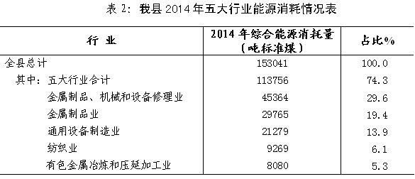 从主要行业能源消耗量分析看:根据县属工业经济运行发展的特色以及各行业对能源的消耗程度,我县能源消耗主要集中在机械和设备修理业、金属制品业、通用设备制造业、纺织业、有色金属冶炼和压延加工业。2014年这五个行业综合能源消耗量为11.4万吨标准煤,占到规模以上工业企业全部综合能源消耗总量的74.3%。(详见表2)。