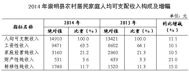 崇明区统计局 2015-02-012014年,崇明县委、县政府坚持将经济发展与民生改善两手抓,始终把改善民生作为崇明现代化生态岛建设的出发点和落脚点,着力推进以改善民生为重点的社会建设,努力提高人民群众生活质量和满意度,农村居民家庭人均可支配收入呈现较快增长态势。