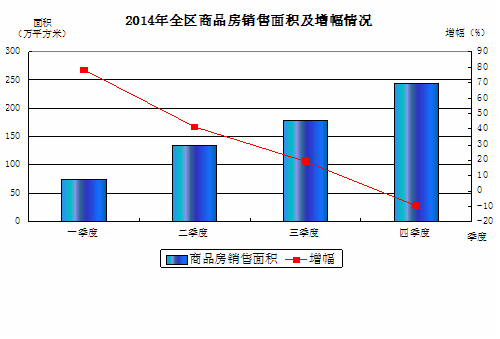 今年我区新建商品房销售延续了上年回稳的态势,2014年,全区新建商品房销售面积244.59万平方米,同比下降9.6%,其中现房销售面积88.02万平方米,同比增长29.3%;期房的销售面积156.58万平方米,同比下降22.7%。