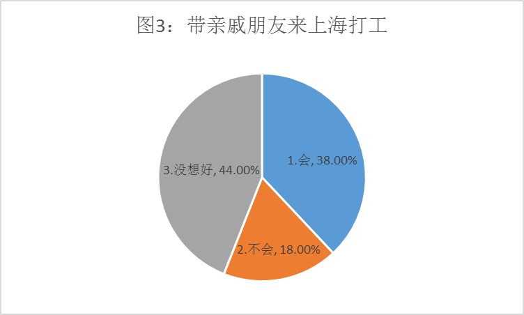 根据抽样调查,68.67%农民工将在今年春节回老家过年,31.33%则留在上海过年。返乡农民工中,97.09%表示将在春节后返回上海,其中,57.00%表示将会携带家人来上海居住和工作,39.00%表示将带子女来上海上学,38.00%表示将带亲戚朋友来上海打工,多倾向于举家在上海生活。