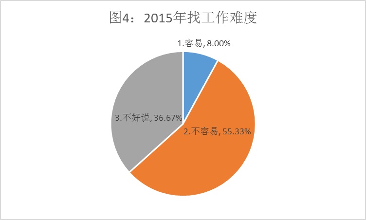 此外,仅有8.00%的调查对象认为在2015年容易找工作,有55.33%认为找工作不容易,有36.67%不确定是否容易。在认为2015年找工作不容易的调查对象中,有74.70%选择将在春节后继续在原单位工作,但其中仍有33.87%对2014年的工资水平表示不满意。