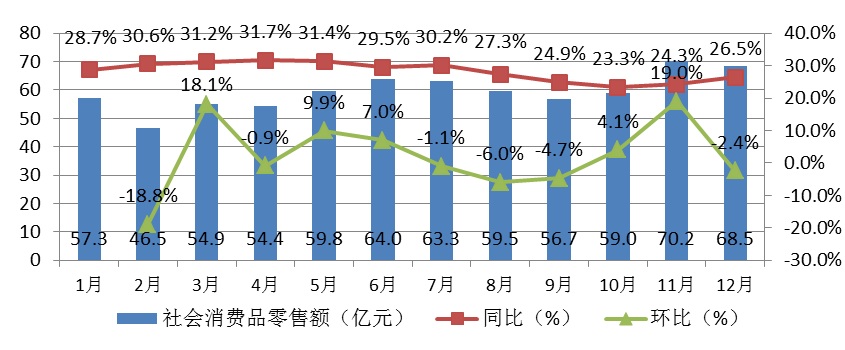 从季度增长走势看,一季度、上半年、前三季度和全年分别比去年同期增长31.2%、29.5%、24.9%和26.5%,下半年增速较上半年小幅下降,但仍保持23%以上增长。在“双十一”电商促销活动刺激下,11月实现社会销售品零售额70.2亿元,环比增长19.0%,为全年最高。