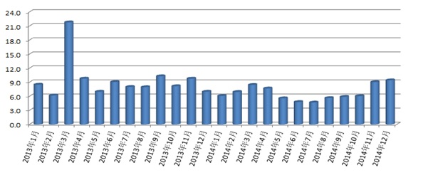 新建商品房市场交易的低迷也影响到二手房交易市场。前三季度存量房交易较为冷淡,在四季度出台了一些稳增长的措施后,使得四季度成交提振明显。2014年,全区存量房(即二手房)交易面积97.8万平方米,同比下降25.3%,环比下降9.0%。其中存量住房80.4万平方米,同比下降29.3%,比去年同期下降113个百分点,环比增长4.3%(见图5)。