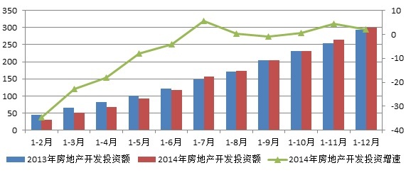 2014年,全区房地产开发完成投资299.3亿元,同比增长2.0%,增幅较上年回落27.3个百分点。从全年走势看,房地产投资增幅呈现先抑后稳的态势。投资增幅由年初下降34.5%逐步回升至1-3月下降22.8%、1-6月下降4.1%、1-9月下降0.8%、1-12月增长2.0%(见图1)。