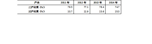 2014年工业能源消费比重下降至74.7%,其占全部能源消费总量的比重逐年下降的趋势愈加明显;与之相反,第三产业能源消耗比重则逐年上升,2014年占比为25.3%(见表4)。