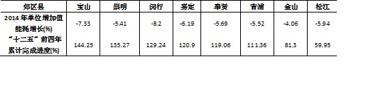 截至2014年,全市单位增加值能耗累计下降22.41%,完成进度127.87%。从8个郊区县完成情况看,只有金山和松江两个区没有完成“十二五”节能目标,见表2。
