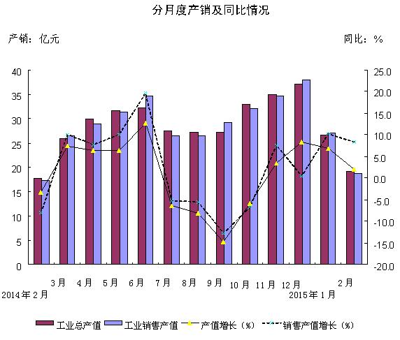 从单月看,2月份全县工业完成总产值19.2亿元,较1月份减少7.4亿元,环比下降27.8%,同比增长2.0%;完成销售产值18.8亿元,较1月份减少8.3亿元,环比下降30.6%,同比增长8.3%。从累计看,1-2月份全县工业完成总产值45.8亿元,同比增长4.4%;完成销售产值45.9亿元,同比增长9.1%。