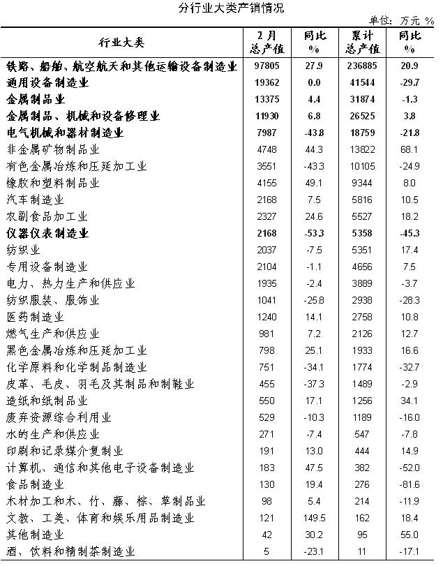 产值下降的行业中,通用设备制造业依旧受到上海振华港机重工有限公司订单集团内部调整转移的不利影响,生产持续萎缩。金属制品业所属企业由于春节错月、经营放缓,产值同比略有下降。电气机械和器材制造业、仪器仪表制造业两大行业则是受到上海中船长欣线缆配套有限公司、上海德科电子仪表有限公司等骨干企业订单减少、生产低迷的拖累,产值同比呈现不同幅度的下降。