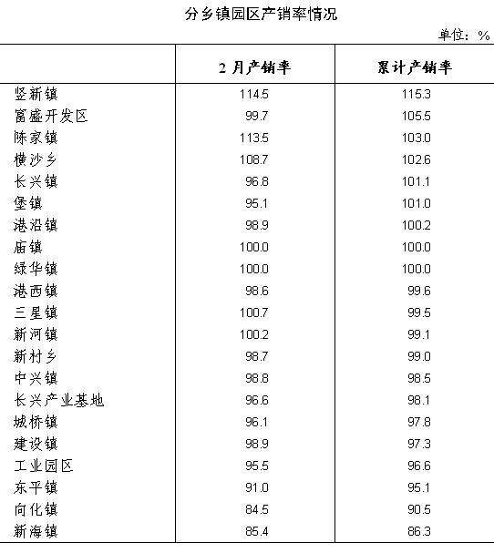 分乡镇园区看,除向化镇和新海镇外,全县其余乡镇和园区中的单月产销率和累计产销率均保持在90%以上。产销率较低的向化镇和新海镇分别是由于上海永冠商业设备有限公司和上海信谊百路达药业有限公司两家企业受到春节长假影响,产品销售数量减少,产销比率相对偏低。