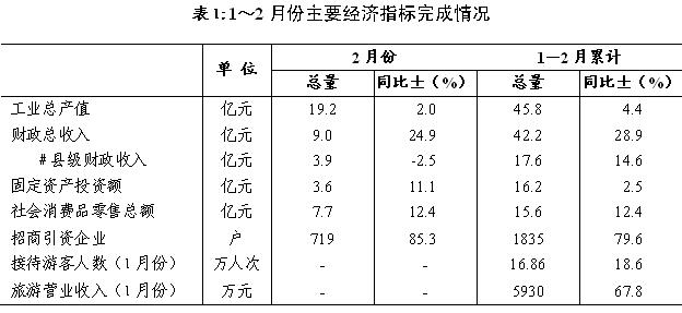 受春节错月的影响,2月份县级财政收入小幅下降,但财政收入累计保持较高的增长速度。2月份,全县实现财政总收入9.0亿元,同比增长24.9%;其中县级财政收入3.9亿元,同比呈小幅下降2.5%。1~2月份,全县实现财政总收入42.2亿元,同比增长28.9%,其中县级财政收入17.6亿元,同比增长14.6%。从税种看,1~2月份累计实现增值税4.5亿元,同比增长15.9%;实现营业税7.0亿元,同比下降0.6%;累计实现企业所得税3.1亿元,同比增长74.2%,对县级财政收入拉动作用明显。