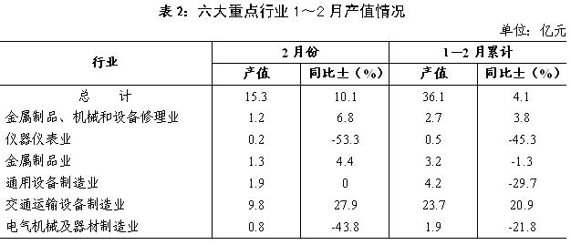 本县六大重点行业在总体上也表现出向好趋势。六大重点行业1~2月份共实现产值36.1亿元,同比增长4.1%。分行业看,呈现“两增四减”趋势,其中实现同比增长的有金属制品、机械和设备修理业,交通运输设备制造业,分别实现产值2.7亿元、23.7亿元,同比增长3.8%和20.9%。同比下降的行业则有仪器仪表业、金属制品业、通用设备制造业、电气机械及器材制造业,分别实现产值0.5亿元、3.2亿元、4.2亿元和1.9亿元,分别同比下降45.3%、1.3%、29.7%和21.8%。