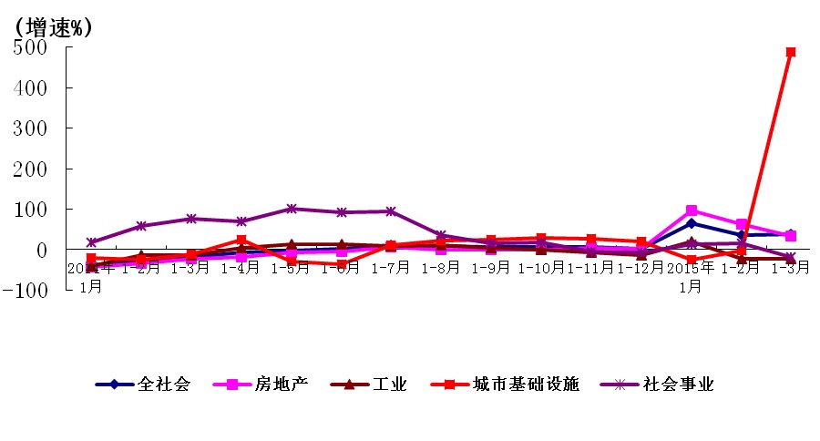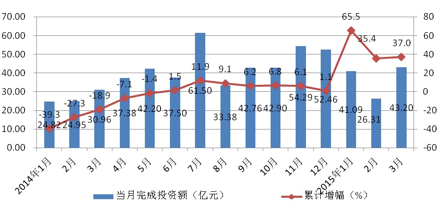 2015年一季度,全区完成固定资产投资110.6亿元,同比增长37.0%。从当月投资总量看,前三个月都保持了较高的投资总量,分别完成投资41.1亿元、26.3亿元和43.2亿元;从投资增速看,前三个月累计增速分别为65.5%、35.4%和37.0%,增速比上年同期分别提高104.8个百分点、62.7个百分点和55.9个百分点,主要原因:一是去年春节在1月份,同期数据较小,二是受到房地产新项目集中入库的影响,投资总量和投资增速均较大幅度高于去年同期。