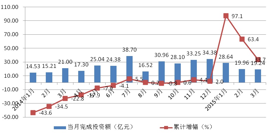 2014年-2015年一季度房地产当月投资及累计增幅情况