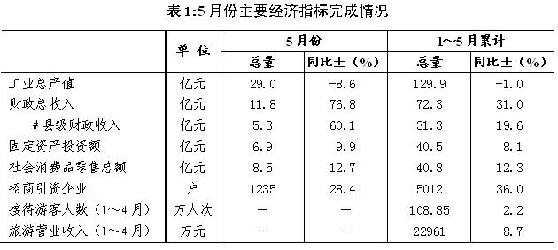 财政收入总量不断增加,增幅较明显。5月份,全县实现财政总收入11.8亿元,同比增长76.8%。其中县级财政收入5.3亿元,同比增长60.1%。从税种看,实现增值税1.1亿元,同比下降5.4%;企业所得税0.7亿元,同比增长44.7%;而受建筑业企业营业税年中集中清算影响,实现营业税2.1亿元,同比增长121.4%。1~5月份,全县实现财政总收入72.3亿元,同比增长31.0%;其中县级财政收入31.1亿元,同比增长19.6%。