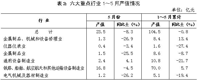 5月份,我县六大重点行业呈现“一增五减”态势,共实现工业总产值23.5亿元,同比下降8.3%。其中,仅有通用设备制造业实现同比增长,其实现产值2.4亿元,增长4.1%。其余五大行业产值均出现同比下降,跌幅较大的有金属制品、机械和设备修理业(同比下降26.9%);电气机械及器材制造业(同比下降26.2%);铁路、船舶、航空航天和其他运输设备制造业(同比下降25.5%)。另外,1~5月份,六大重点行业共实现工业总产值104.5亿元,同比下降0.8%。