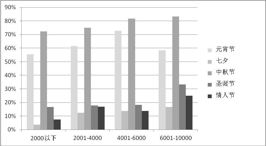 从收入水平角度看,收入水平越高,对节日的重视程度也越高(如图1),尤其是需要一定消费的节日,如传统节日七夕、中秋节等;还有一些洋节日如圣诞节、情人节等。