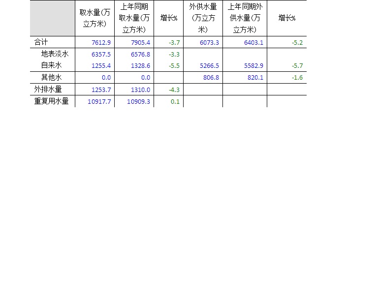 受工业生产低迷影响,规模以上工业取水量为7612.9万立方米,较去年同期下降3.7%,万元工业产值取水量为11.0立方米/万元,同比增长1.4%。重复用水量不降反升,同比增长0.1%。