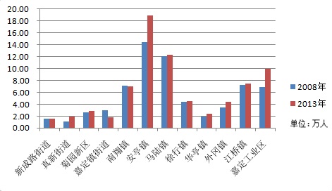 图2 嘉定区各街镇从业人员2013年和2008年对比情况