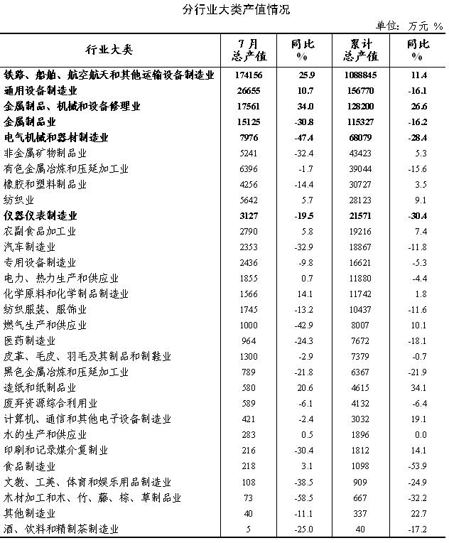 六大重点行业7月份完成总产值24.5亿元,同比增长13.0%,增幅高于全县水平3.7个百分点;前七个月完成总产值157.9亿元,同比增长3.3%,增幅高于全县水平1.7个百分点。重点行业单月产销运行呈现三增三减态势,但从累计数据来看,除铁路船舶航空航天和其他运输设备制造业、金属制品机械和设备修理业两大行业以外,其余各个行业自年初起始终面临客户订单减少、企业开工不足、产能利用率低的不利局面,生产经营持续低迷。