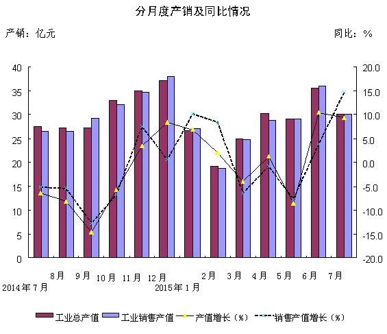 从单月看,7月份全县工业完成总产值30.0亿元,同比增长9.3%;完成销售产值30.2亿元,同比增长14.6%。7月份虽因连日高温,多家工业企业停产放假、经营天数减少,产销总量较之6月份有所下降,但从同比数据看依旧保持平稳增长。