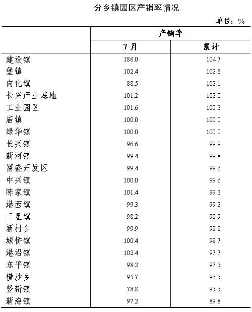 全县21个乡镇及园区中,除新海镇外,其余乡镇园区的累计产销率均在90%以上,产销衔接处于较高水平。累计产销率略低的新海镇,主要是由于上海信谊百路达药业有限公司8月份即将停产进行设备检修,企业为满足今后的销售需求,7月份加快生产进度、产值显著增长,由此造成企业产销率偏低。以上情况属于企业经营的正常波动,而非产品不良的库存积压。
