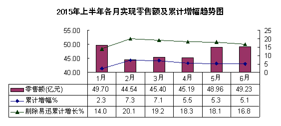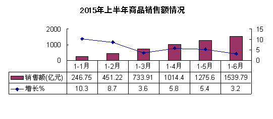 据统计,2015年上半年实现商品销售额1539.79亿元,比上年同期增长3.2%,实现社会消费品零售总额283.02亿元,增长5.1%。